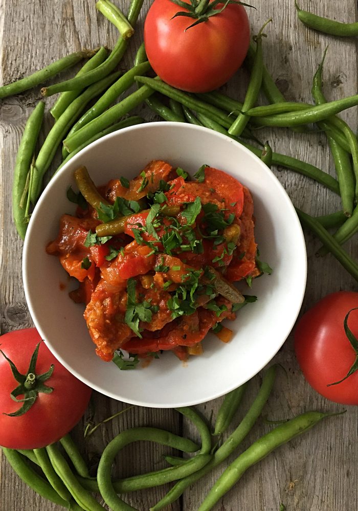 Po udanych sobotnich łowach na rynku warzywnym miałem całą kuchnię zapasów. Tak jestem facetem, łowcą, jestem myśliwym i drapieżcą. Po udanych eksperymentach z bobem, kalafiorem i agrestem, przyszedł czas na fasolkę szparagową. Nie ukrywam, że po głowie chodziło mi wciągnięcie jej w formie klasycznej, czyli ugotowanej z dodatkiem tartej bułki. Niezapomniany smak dzieciństwa, kiedy zielony strąk królował na talerzu. Nie potrzebowałem wtedy nic więcej. Żadnych ziemniaków, mięsa pływającego w sosie, czy innych dodatków. Wystarczył szabel (tak nazywano fasolkę szparagową u mnie w domu). Ten pomysł jednak mogę realizować w zaciszu kuchennym, bez fajerwerków i publicznej prezentacji. Potrzebowałem czegoś, co będzie bardziej rozbudowane i pozamiata kubkami smakowymi jak Jan Himilsbach tekstami. Przeprowadziłem szybą ocenę sytuacji i dostrzegłem w koszu 3 czerwone papryki. W tym momencie mnie olśniło, gdyż przypomniałem sobie o ostrym przecierze paprykowym, który dostałem od Kasi i Jacka. Wiedziałem, że to jest ten dzień, w którym otworzą się bramy ciemności. Czułem, że zielona fasolka szparagowa, przekroczy bramy piekła. Oj będzie piekła.