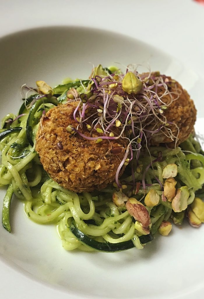 - Do pietruszki dorzucamy czosnek, płatki drożdżowe, olej, sok z cytryny, pistacje i przyprawy. Wszystko miksujemy tak by powstało pesto, które finalnie mieszamy z cukiniowym makaronem.