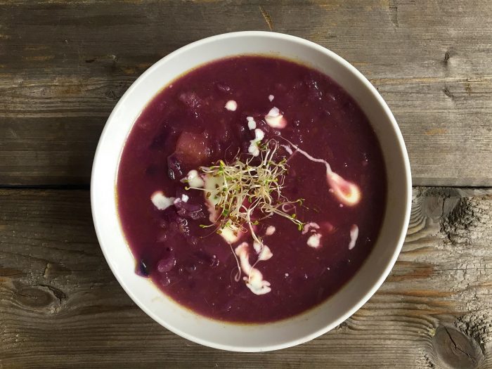 - Podajemy ze śmietanką sojową i kiełkami.