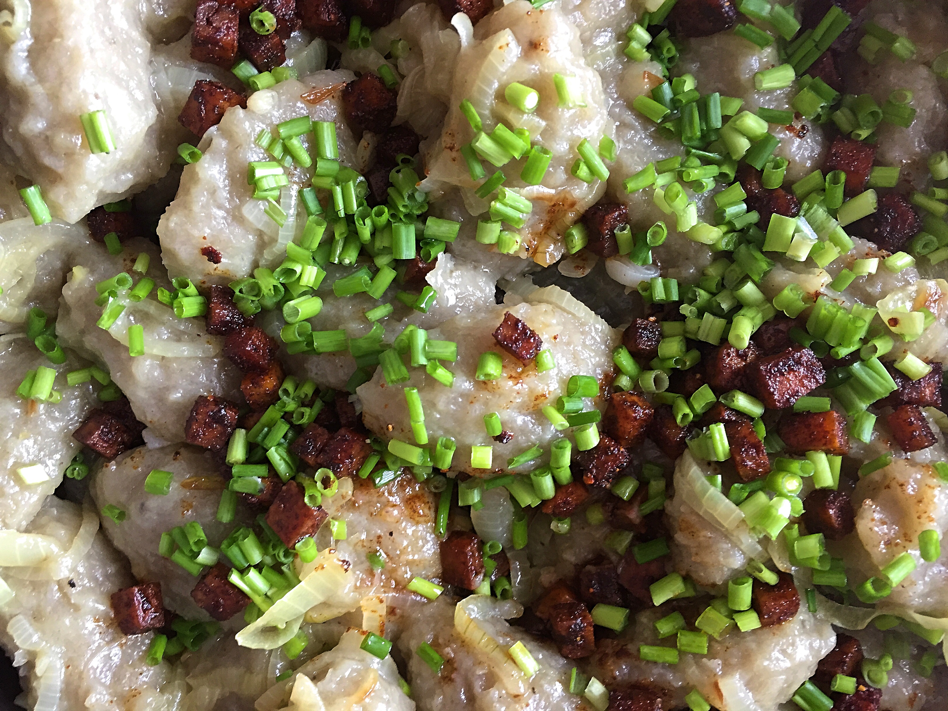 - Z masy ziemniaczanej odrywamy odrywamy kawałek ciasta, formujemy kulkę i rozpłaszczamy ją na dłoni, tworząc „krążek” o grubości” ok. 5mm. Łyżeczką nakładamy farsz, na środek i zamykamy całość, tworząc kulkę. Gdy już mamy gotowy produkt, wrzucamy go do osolonego wrzątku. Po wypłynięciu na powierzchnię gotujemy przez 4 minuty. Podajemy okraszone podsmażoną cebulą i szczypiorem.